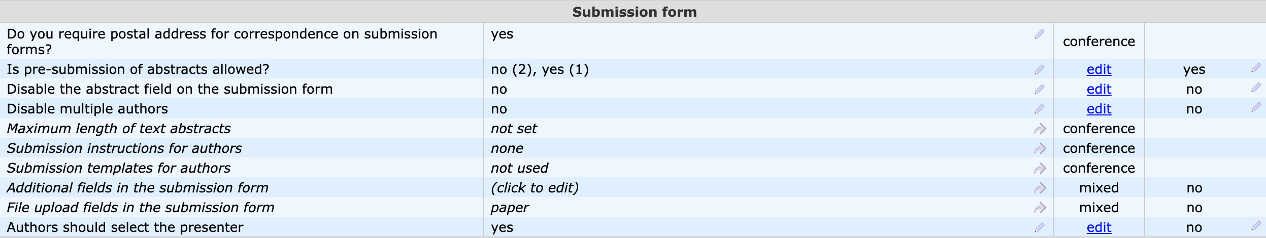 To understand what chairs can do with the submission form, chairs should access the configuration page (menu tabs Administration -> Configure). There is a a whole section on the submission form. Chairs can click on the leftmost column to get explanation on what the options mean.